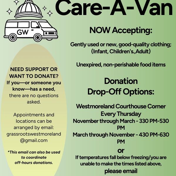Join Grassroots Westmoreland EVERY Thursday, from 430PM-630 PM, for our Care-A-Van!